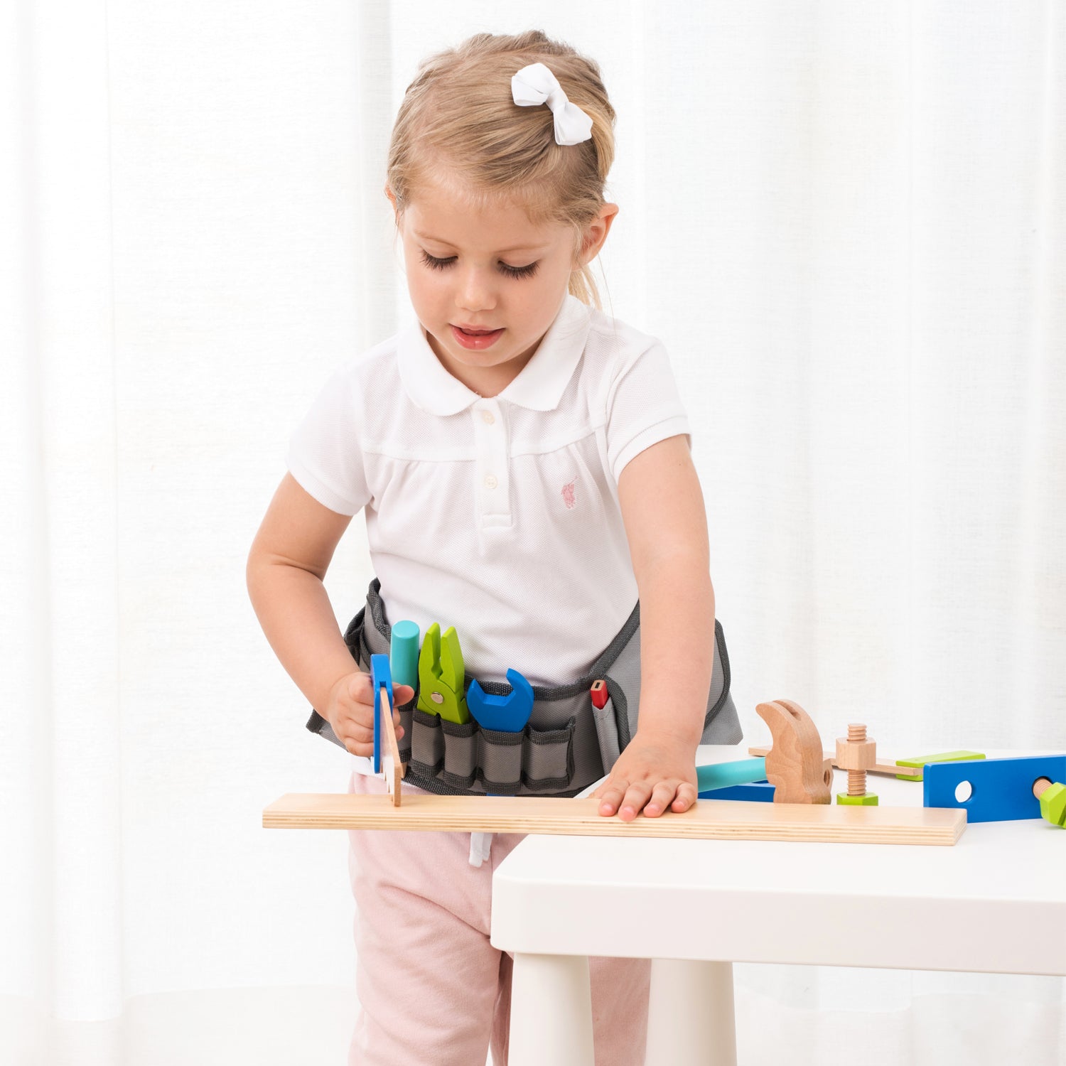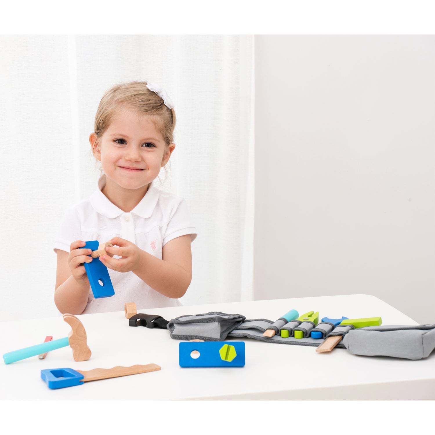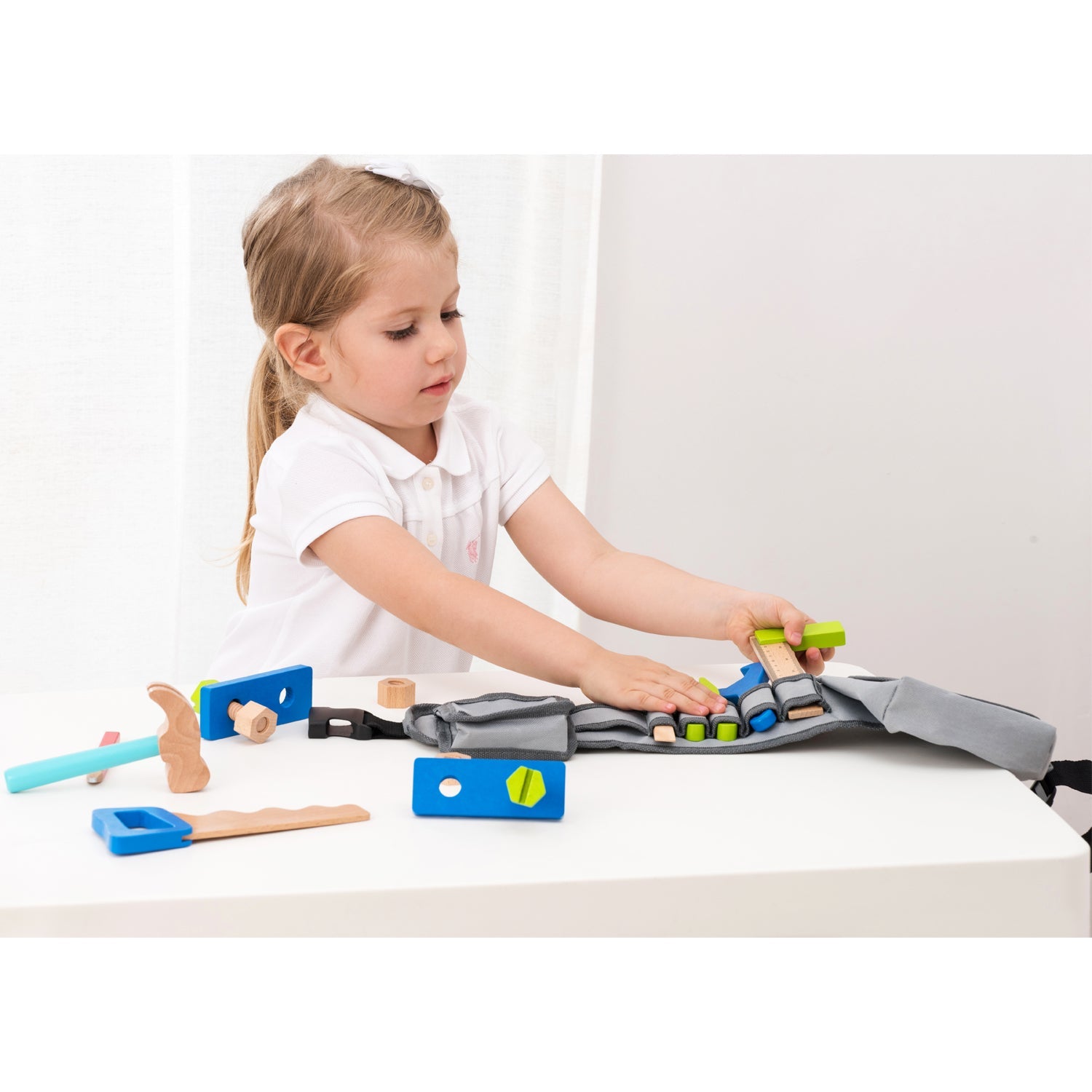 All pretend tools fit perfectly in convenient storage slots of the fabric tool belt making it the perfect role play toy for little ones. This set helps teaching sorting and is perfect for developing problem-solving and logical thinking skills. It also encourages fine motor skills, hand-eye coordination and imaginative play. The fabric tool belt is adjustable.